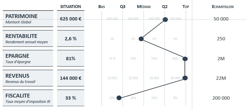 - Finalement, son patrimoine est très important par rapport à population française, et il est également au-dessus de la moyenne des français ayant ce niveau de revenus, en se situant proche de la limite du premier quartile.