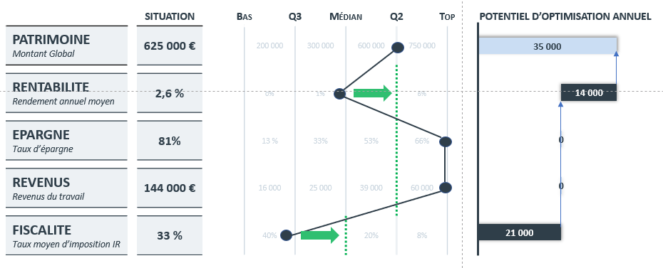 On peut voir qu’une amélioration de la rentabilité actuelle du patrimoine jusqu’au niveau des bonnes pratiques constatées (soit de 2,6% à 4%), génèrerait 15,000 euros supplémentaires par an. De même, une réduction de la fiscalité jusqu’au niveau moyen pour des revenus semblables (soit de 33% à 25%) aurait un impact annuel de 21K€. Les autres leviers (épargne, salaire), semblent déjà très bien exploités. La prochaine étape dans ce cas est évidemment de creuser dans le détail de la situation personnelle pour atteindre ces deux objectifs dont le potentiel total serait de +35K€ par an !
