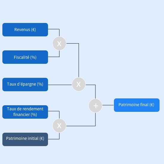 Afin d’évaluer et de hiérarchiser les leviers d’actions de votre patrimoine, nous avons simplement décomposé les principaux déterminants de ce dernier, qui s’établissent chaque année comme suit :