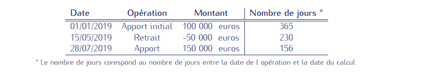 Où Pi est la proportion de temps entre l’apport (ou retrait) et la fin de la période considérée i.e :