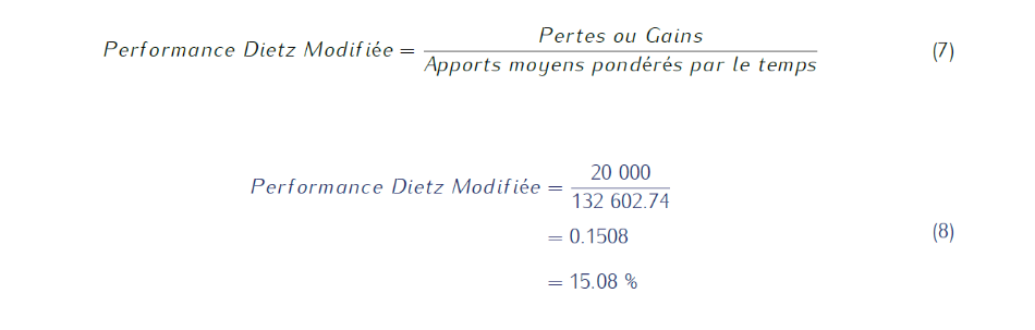 où, la Performance Dietz Modifiée, les Pertes ou Gains et les Apports moyens pondérés par le temps sont tous mesurés à la date t.