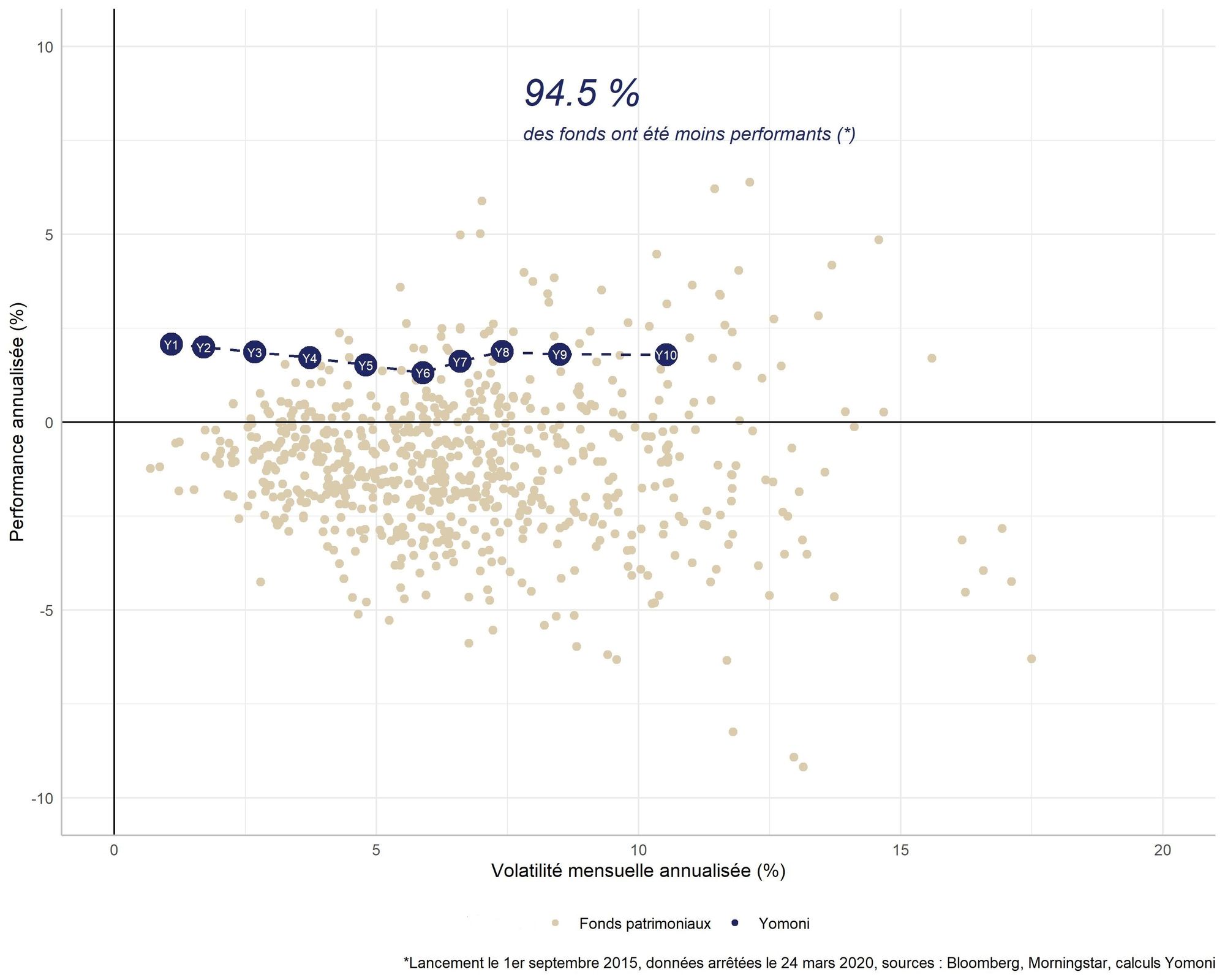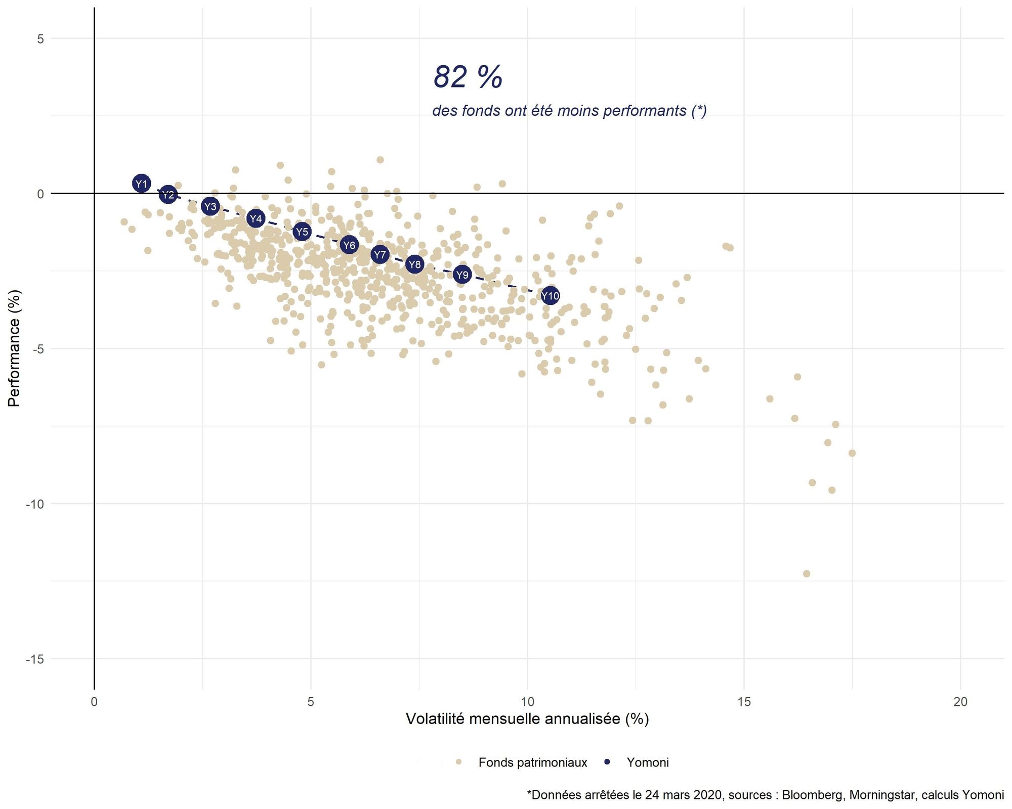 (*) Le pourcentage de fonds moins performants que nos mandats est le rapport entre le nombre de fonds se trouvant au dessus de la ligne en pointillé tracée entre Y1 et Y10 et le nombre total de fonds ayant des niveaux de risque (volatilité) compris entre le niveau de risque du Y1 et Y10.