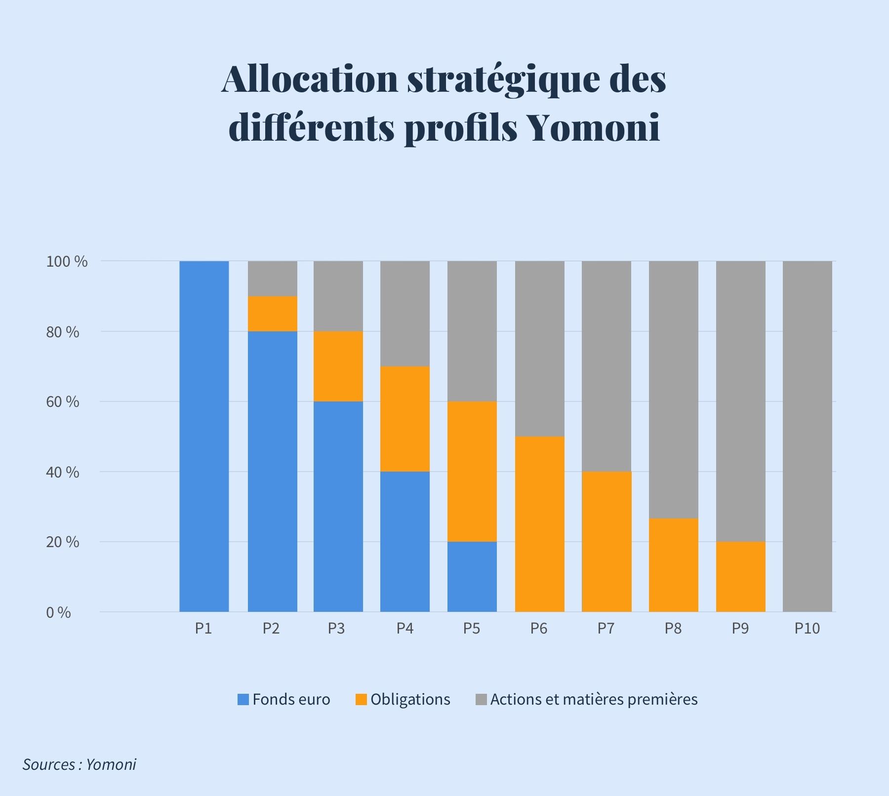 On comprend intuitivement que moins le profil est risqué, moins l’allocation stratégique correspondante comportera d’actions. Dans le cas du profil P1, la part des actions est même nulle (l’intégralité du portefeuille est allouée au contrat en euro, l’actif sans risque). À l’autre bout du spectre, le profil P10 est intégralement investi en actions, l’actif le plus risqué que l’on puisse envisager (mais aussi le plus performant, en moyenne et à long terme) dans le cadre le plus généralement et classiquement accepté aujourd’hui (nous excluons les actifs sur lesquels on manque sérieusement de recul, comme les cryptomonnaies par exemple).