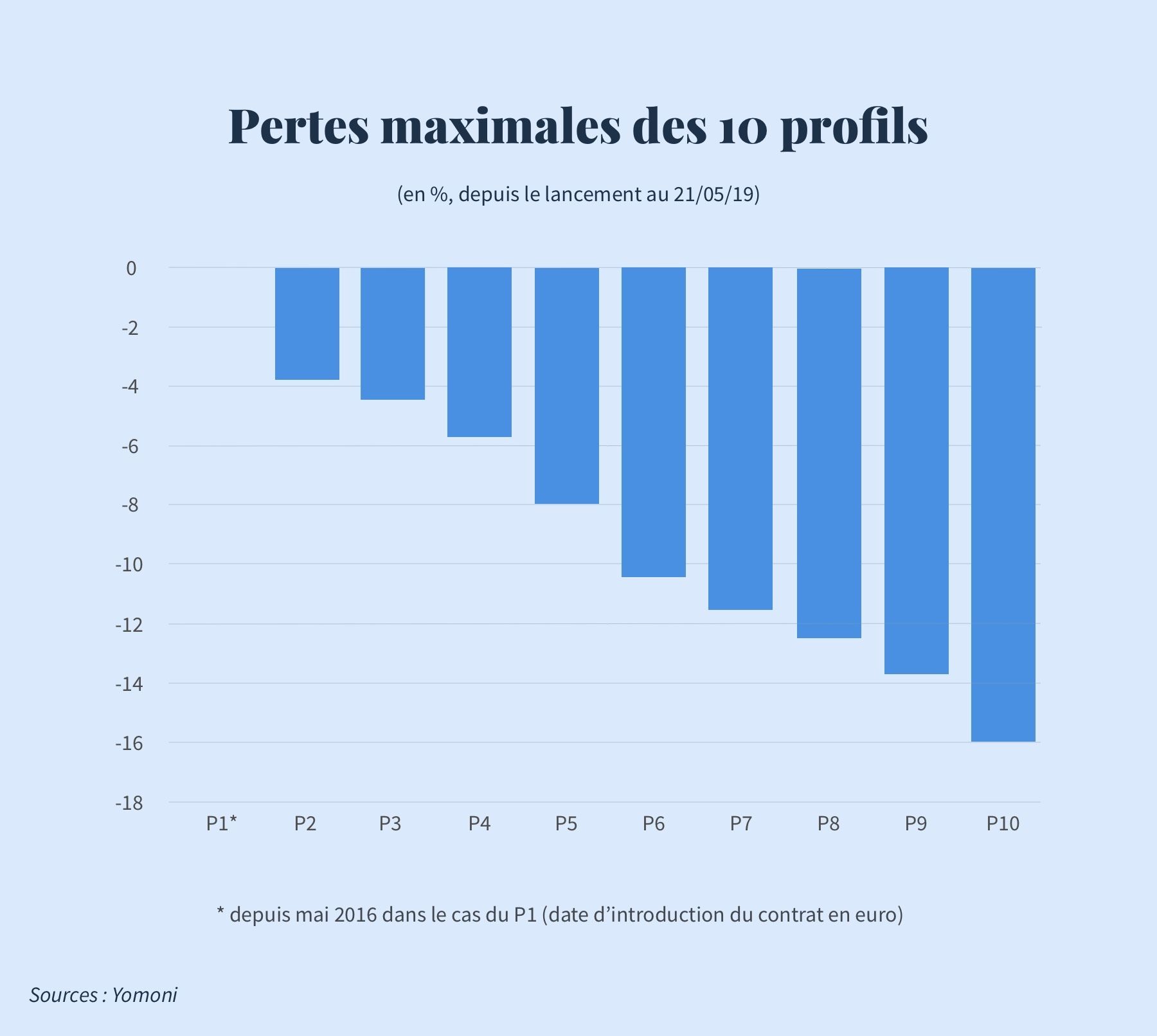 Le résultat est conforme aux attentes, ce qui est rassurant. D’une part plus le profil est risqué, plus la performance obtenue est élevée (prendre du risque a été payant sur la période, ce qui est conforme à l’intuition). D’autre part, le profil le moins risqué présente une perte maximale égale à zéro (le risque d’une performance négative est nul), mais ensuite la perte maximale observée sur la période augmente régulièrement pour chaque profil et atteint son maximum avec le profil 10.
