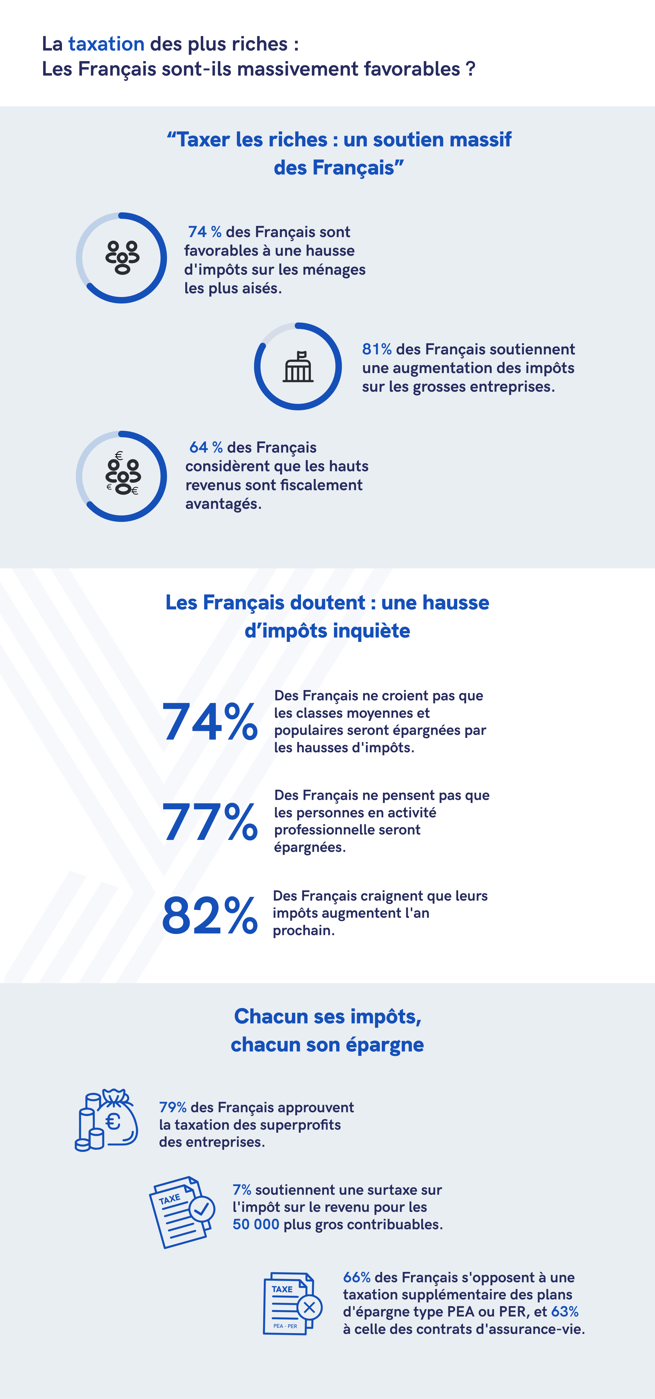 Toutefois, lorsqu'il s'agit de toucher à l’épargne populaire, la réaction est tout autre. 66% des Français s'opposent à une taxation supplémentaire des plans d’épargne comme le PEA ou le PER, et 63% rejettent toute augmentation des impôts sur les contrats d'assurance-vie. L’attachement à ces produits d’épargne est particulièrement fort chez leurs détenteurs, qui craignent de voir leur patrimoine personnel affecté par de nouvelles réformes fiscales.