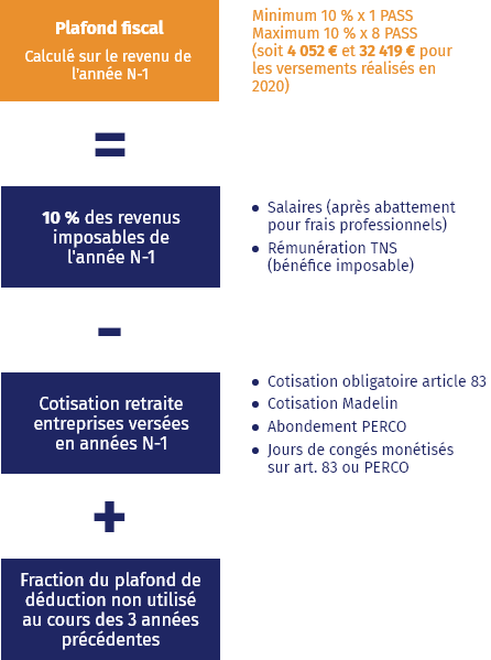 Les versements sont soumis à un plafond. Saisissez votre dernier avis d’impôt et rendez-vous à la dernière page, rubrique “Plafond Épargne Retraite” pour connaître ce plafond éligible à l'épargne retraite. Ce dernier est commun aux autres dispositifs d’épargne retraite (PERCO…), cumulable et utilisable pendant trois ans glissants.