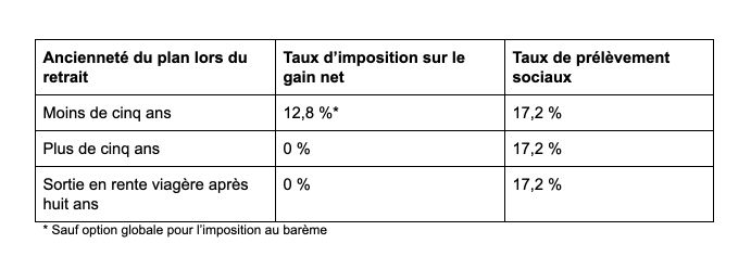 En cas de retrait, le taux d'imposition sera variable en fonction de l’ancienneté du plan.