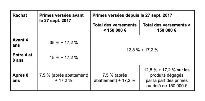 L'imposition de l'assurance-vie est résumée dans ce tableau :
