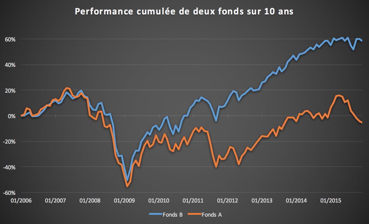 Prenons l’exemple de deux fonds, A et B, entre les années 2006 et 2016, dont les performances sont représentées sur le graphique ci-dessous.