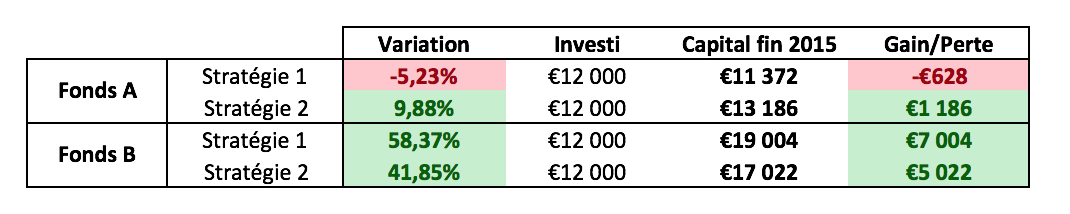 Pour le fonds A, on remarque la puissance d’une stratégie d’épargne progressive qui donne une performance positive (9,88%) alors que la variation totale sur 10 ans est négative (-5,23%).