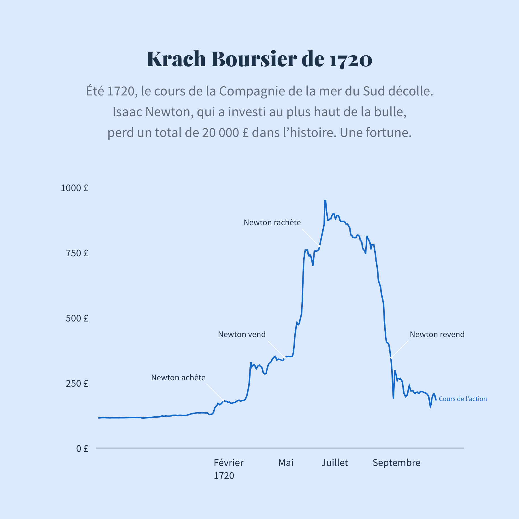 Et puis la gravité reprend ses droits. C’est la chute. Tout s’écroule. La bulle éclate. Les bénéfices annoncés par la compagnie ne sont pas au rendez-vous. Les achats d’actions financés à crédit sont liquidés dans la panique. Les banques accusent le coup. On découvre que les Lords qui soutenaient la Compagnie étaient corrompus. Le cours plonge. Newton prend un coup sur la tête. Il revend ses actions à la fin de l’été, après avoir essuyé une perte de 60 %. En novembre, le cours retombe à 180 £, bien loin des 950 £ atteints au début de l’été. Au total, Isaac aura perdu 20 000 £ dans l’histoire, ce qui représenterait aujourd’hui 2,7 millions de livres sterling.