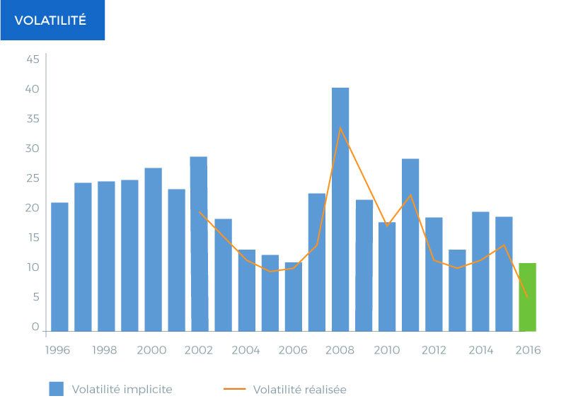 La volatilité des marchés, c’est un peu comme la hauteur des vagues en haute mer. Elle reflète l’agitation des marchés, à la baisse comme à la hausse. La volatilité réalisée est calculée à partir des variations de marché qui ont eu lieu, et l’implicite est calculée à partir du prix que les investisseurs offrent pour s’en protéger (elle est donc en moyenne supérieure). Pour l’instant, on constate donc une mer très calme…