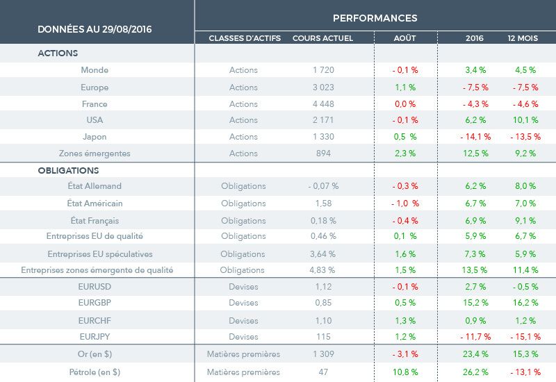 - A court-terme, les autorités monétaires américaines (FED) préparent les marchés à une hausse des taux d’ici la fin d’année. En effet, Janet Yellen de la Fed considère qu’une remontée des taux semble à nouveau pertinente avec la dissipation des risques post-Brexit, à la condition que les statistiques des deux prochains mois confirment la bonne tenue de l’activité.