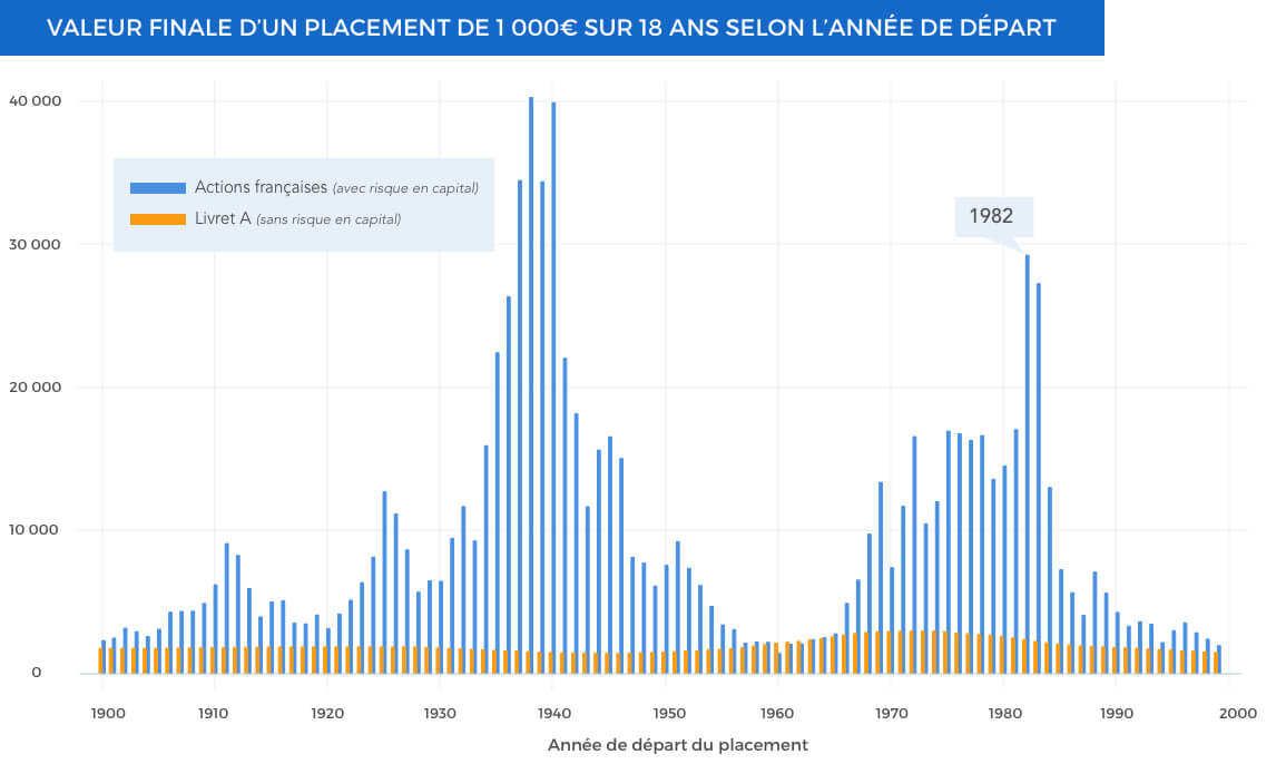 - L’apprentissage ne se fait pas sur le papier mais bien en restant investi. On apprend bien plus de ses échecs que de ses succès, d’autant que les succès spectaculaires interrompent bien souvent la poursuite du long-terme. Au total, un franc placé sur le Livret A pour 10 ans rapportait certes bien moins qu’un placement en actions2 sur la période. Mais ce même franc rapportait plus que +50 % placés en actions sur 18 mois seulement.