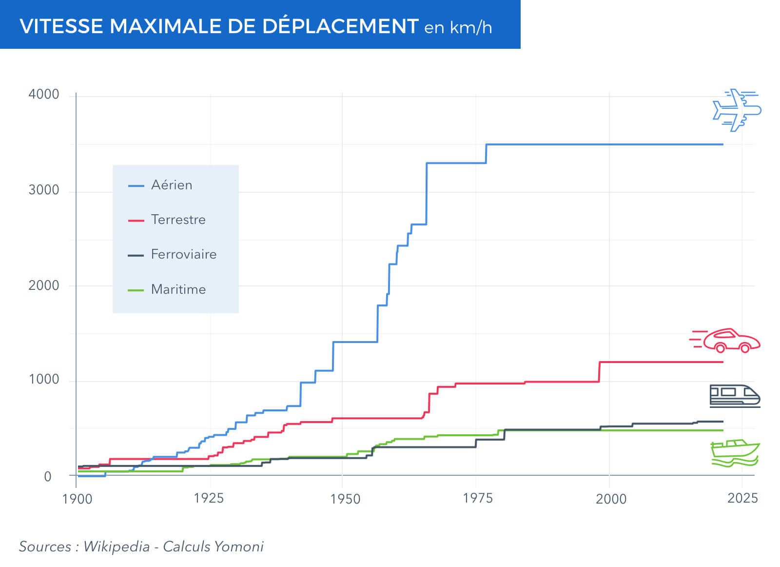 Il semble en aller de même pour les avancées technologiques. Quantitativement, le progrès technique s’est ralenti. Les inventions d’envergure sont de moins en moins nombreuses. Les antibiotiques, l’énergie nucléaire, la conquête de l’espace, de la Lune, et même le Concorde, datent tous de plus de 50 à 60 ans, alors que 60 ans auparavant, on traversait à peine la Manche en monoplan ! Depuis toujours, la vitesse de transport des humains a illustré le progrès technique, or que ce soit, sur terre, sur mer, ou dans les airs, nos vitesses moyennes de déplacement n’ont pas progressé depuis les années 1970. Le TGV, c’était déjà il y a 40 ans… Même l’Internet date aussi de cette époque.