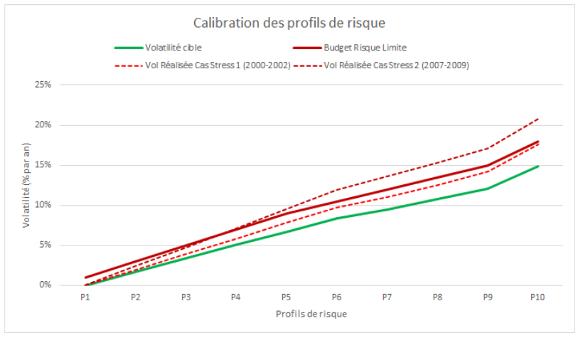 Ils sont calibrés en niveau de volatilité historique. Néanmoins, la méthodologie réglementaire n’interdit pas de réfléchir et nous utilisons beaucoup la VaR, et sa cousine la cVaR pour obtenir des portefeuilles robustes en termes de pertes maximales. C’est à partir de plusieurs méthodes de mesure de risque que nous avons donc construit les profils, en particulier le P6, notre portefeuille optimal cross-assets qui nous permet de construire les autres.
