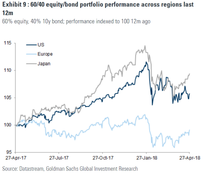 Voici une analyse de Goldman Sachs sur le sujet des performances modestes des allocations d’actifs traditionnelles Actions/Obligations depuis un an. En comparant des portefeuilles en trois devises de références (USD, JPY et EUR), on voit très bien l’impact de l’appréciation de l’euro sur la performance des portefeuilles européens. Nos portefeuilles font un peu mieux que cette estimation, mais les performances restent modestes comme vous l’avez constaté. Heureusement, le jeu des devises entre elles, se neutralise sur le long-terme.