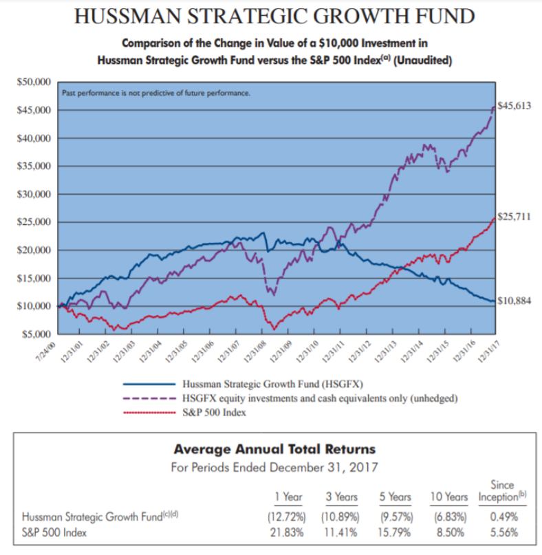 Nous essayons de ne pas tomber dans le piège de la vue unilatérale comme Abby Cohen à sa grande époque de Goldman Sachs et il est toujours utile de lire des avis contraires. Si cela vous intéresse, notre référence en la matière, se nomme John Hussman, gérant américain depuis près de 30 ans. Il publie une tribune mensuelle sur internet avec toutes ses archives hebdomadaires disponibles depuis 2000. Il a prédit avec justesse le krach de 2000 et celui de 2008, mais aussi celui de 2013, de 2014, de 2015, 2016, etc... Sa vision est remarquable et son honnêteté intellectuelle ne peut pas être remise en cause, mais son track record ci-dessous ne milite pas en faveur du “market timing” pour éviter le Krach. Fort de sa conviction d’un marché trop cher et trop spéculatif (“overvalued and overbought’), il a régulièrement couvert ses expositions avec des options (c’est-à-dire des achats d’options de vente : des PUT), détruisant petit à petit dix années de performances.