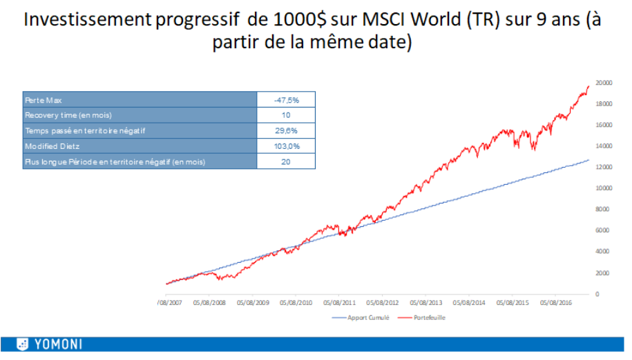 À titre d’exemple, nous avons comparé ci-dessous un investissement sur le MSCI World en 2007 à un investissement du même montant lissé sur 9 ans (à partir de la même date) :
