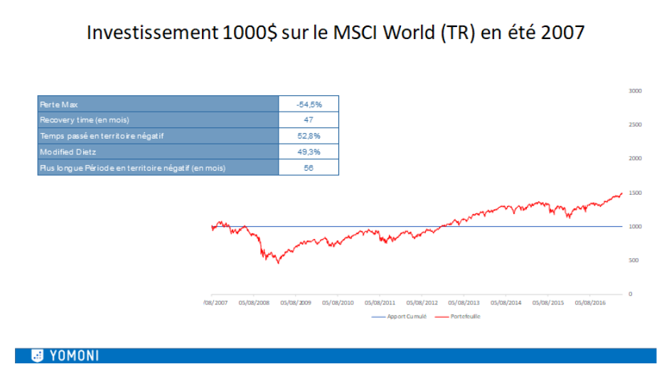 Nous conseillons toujours à nos clients de lisser leurs versements, cela permet de réduire la volatilité (et donc le risque) de votre investissement. Prenons l'exemple d'un investisseur qui aurait investi 10 000$ sur le S&P 500 en 2007 au plus haut des marchés : il lui faudra 5 ans et demi environ pour récupérer sa mise initiale. Alors que celui qui aurait mis la même somme en la lissant trimestriellement met 1 an et demi à récupérer sa mise.