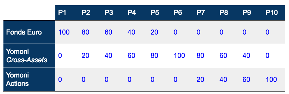 En bref, tous les profils sont alignés à partir des réallocations faites dans le P6 (“cross-assets”) et dans le P10 (“cross-equities”). Par exemple, un achat d’actions européennes se retrouve dans tous les portefeuilles du P2 au P10, mais un achat de pétrole ne se retrouve pas dans le P10.