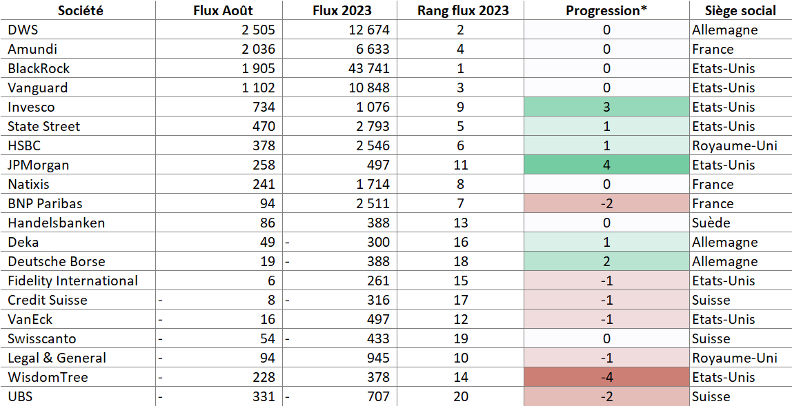 - DWS, la filiale de Deutsche Bank, continue sur sa lancée et s'adjuge la première place du classement sur le mois d'août et Amundi s'adjuge la deuxième place