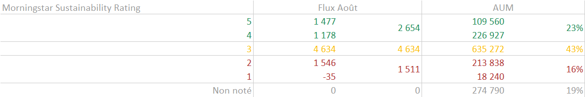 - La part des investissements dans des ETF actions ayant une composante extra-financière est relativement stable désormais sur la partie actions et représente sur le mois d'août environ 30%. En revanche, d'une manière générale, l'attrait de ces composantes ESG est beaucoup plus variable en fonction des mois. Août a été un mois très solide sur cet aspect.
