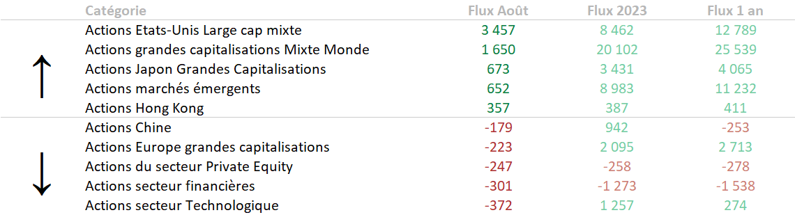 - La collecte reste concentrée plutôt sur les grandes capitalisations. On peut noter un regain d'intérêt sur les actions des marchés émergents à l'exception des actions chinoises. En matière de sortie de capitaux, on peut noter l'inquiétude au cours du mois d'aout sur les actions européennes de grandes capitalisations et sur les actions du secteur financier et du secteur de la technologie de l'information.