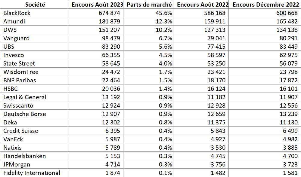 - Pas de changement particulier à noter en matière de parts de marché ce mois-ci. BlackRock est toujours très largement en tête et représente plus de 45% du marché de la gestion indicielle en Europe. Amundi et DWS viennent compléter le podium.