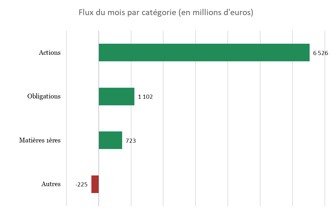 - Les actions ont capté près de 85% de la collecte nette, tandis que la collecte en obligations a nettement ralenti avec 1,1 milliard d'euros collectés sur le mois contre 9 milliards le mois précédent (soit près de neuf fois moins).