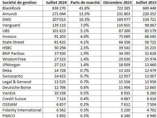 - Pas de changement notable en termes d'encours à fin juillet. BlackRock reste leader avec presque 42% de parts de marché, suivi de très loin par Amundi avec 13,5%, qui maintient DWS à distance avec 10,3%. Vanguard et UBS complètent le top 5.