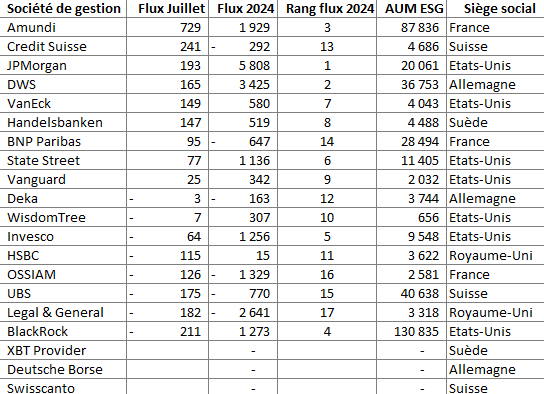 - En termes de collecte, Amundi est la société de gestion qui a le plus collecté en juillet dans l'univers des ETF intégrant des critères extra-financiers, suivie par Crédit Suisse et JP Morgan, qui reste le solide leader depuis le début de l'année. À noter, ce qui est peu fréquent, BlackRock se retrouve en juillet comme le moins bon émetteur sur ce segment de marché. Le leader global des ETF en Europe reste néanmoins en 4ème position en termes de souscriptions sur les ETF incluant des critères extra-financiers depuis le début de l'année.