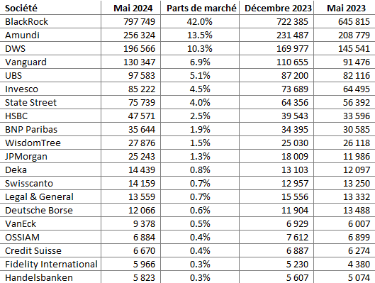 - Le classement des encours par société est très stable dans les dix premières positions. BlackRock représente 42% du marché, et les trois premiers émetteurs représentent près des deux tiers des encours totaux en Europe