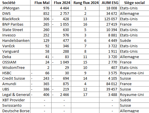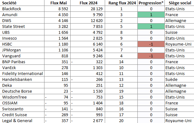 - Le podium en termes de collecte pour le mois correspond au classement par encours des émetteurs, avec dans l'ordre BlackRock, Amundi, et DWS.