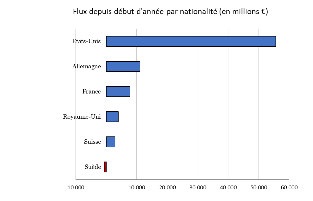 - Les rachats sur les ETF actions se sont concentrés sur les actions suisses, allemandes, les grosses capitalisations européennes, et les actions italiennes. Des rachats notables ont également eu lieu sur les actions américaines de grosses capitalisations.