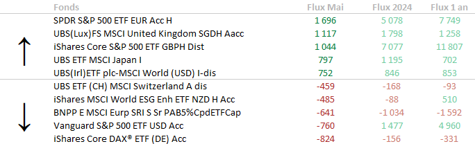- 27,4 milliards d'euros de collecte nette sur les ETF en mai. C'est une collecte historique, la plus élevée des trois dernières années. Après un mois d'avril relativement faible, mai a largement compensé, portant la collecte nette depuis le début de l'année à plus de 80 milliards d'euros. À titre de comparaison, la collecte nette s'élevait à 160 milliards d'euros en 2023, contre 6 milliards le mois précédent.