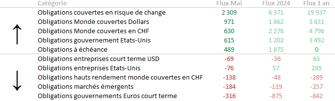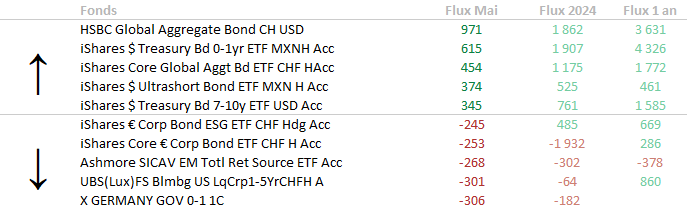 - Concernant les rachats obligataires, les obligations gouvernementales en euros à court terme ont concentré le plus de rachats, surtout en anticipation de la première baisse des taux de la BCE. Par ailleurs, on observe une baisse d'intérêt pour les obligations les plus risquées, avec des rachats sur les ETF obligataires liés aux marchés émergents, aux obligations à haut rendement couvertes en CHF, et aux obligations d’entreprises américaines.