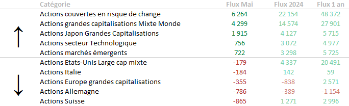 - Les thèmes porteurs restent constants, à savoir les grandes capitalisations et les actions couvertes contre le risque de change. Les grandes capitalisations japonaises ont également suscité un intérêt particulier, malgré des performances mitigées en mai. Les actions du secteur technologique continuent d’attirer les investisseurs grâce notamment aux bonnes performances durant le mois. Un regain d’intérêt pour les actions émergentes est aussi à noter en mai, malgré des performances globalement décevantes.