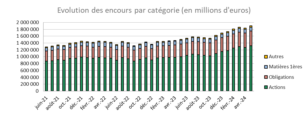 - La classe d'actifs actions reste celle qui concentre les encours les plus importants. Cela s'explique par des flux significatifs, mais aussi par un effet de valorisation des marchés actions qui a été plus marqué en mai que pour les obligations.