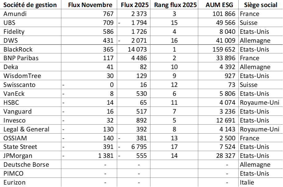 - Après un mois d’octobre particulièrement favorable, novembre marque un net ralentissement de la dynamique ESG. Bien que la collecte reste légèrement positive, elle ne représente que 4 % de la collecte totale du mois.