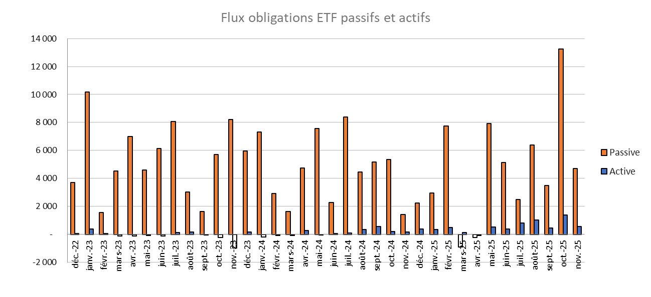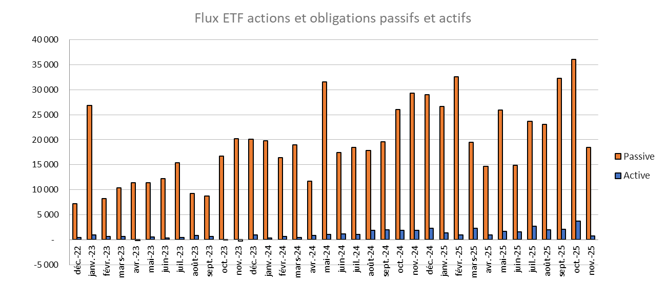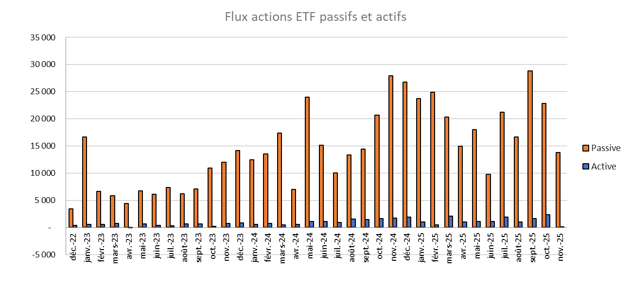 - Le mois de novembre s’est en revanche distingué par une faible contribution des ETF ESG et des ETF actifs, dont les parts de marché reculent.