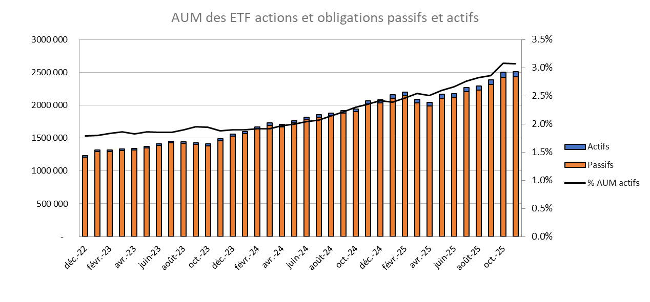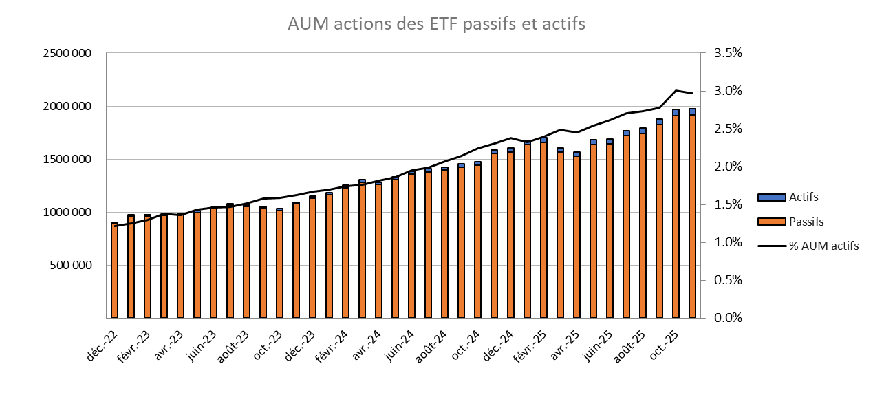 - En termes d’encours, la part des ETF actifs reste stable : 3 % pour les actions et 3,4 % pour les obligations.