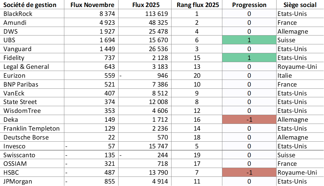 - La hiérarchie demeure stable à fin novembre, mais la part de marché cumulée des trois principaux émetteurs continue de s’effriter, s’établissant désormais à 62,4 %. UBS, portée par une forte collecte sur le mois, se détache légèrement d’Invesco.