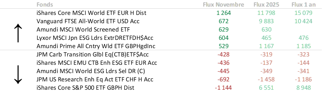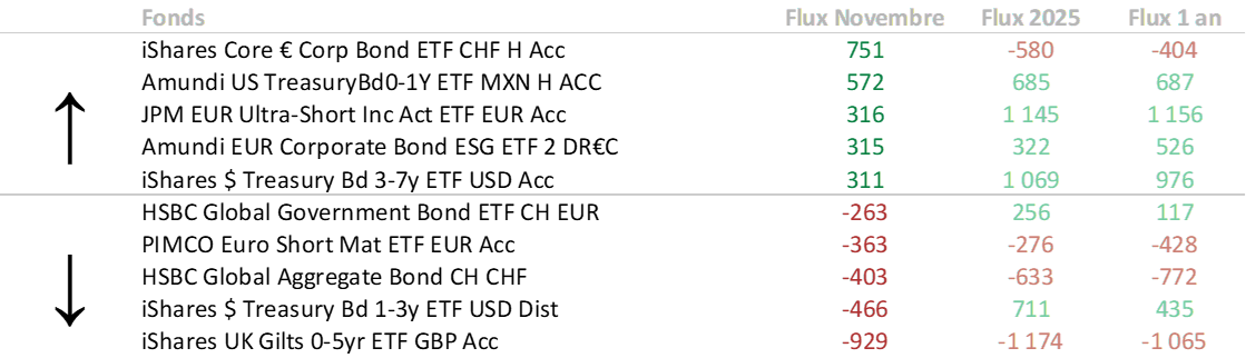 - Parmi les principaux produits en forte décollecte, on retrouve deux ETF iShares et deux HSBC. Les rachats les plus significatifs concernent les obligations souveraines britanniques de maturité 0 à 5 ans, les obligations souveraines américaines de maturité 1 à 3 ans, ainsi qu’un ETF global aggregate libellé en francs suisses. De fortes sorties ont également été observées sur des ETF obligations court terme en euros et sur des fonds souverains mondiaux, également libellés en CHF.