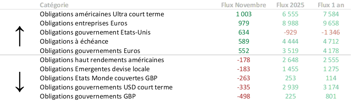 - Les décollectes ont concerné les obligations souveraines libellées en livres sterling, les obligations souveraines américaines de court terme, les obligations mondiales couvertes en GBP, les obligations émergentes en devises locales et les obligations d’entreprises américaines à haut rendement.