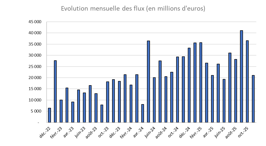 - Avec un peu plus de 21 milliards d’euros de souscriptions nettes, novembre affiche une collecte inférieure à la moyenne mensuelle de 2025, située autour de 29 milliards d’euros.
