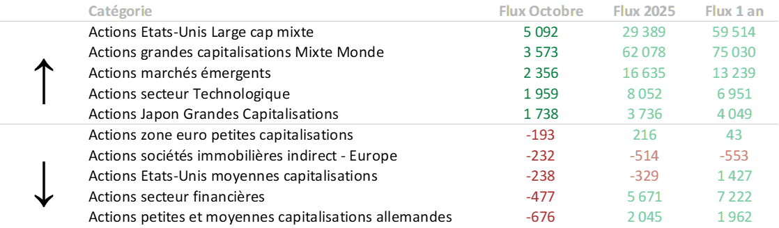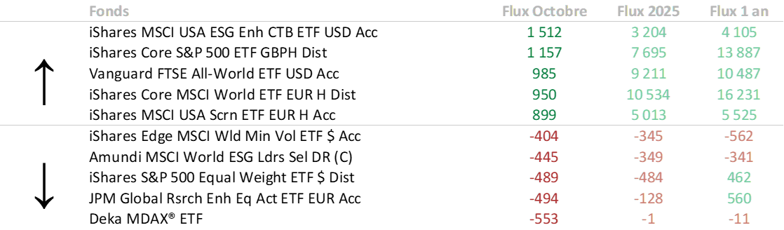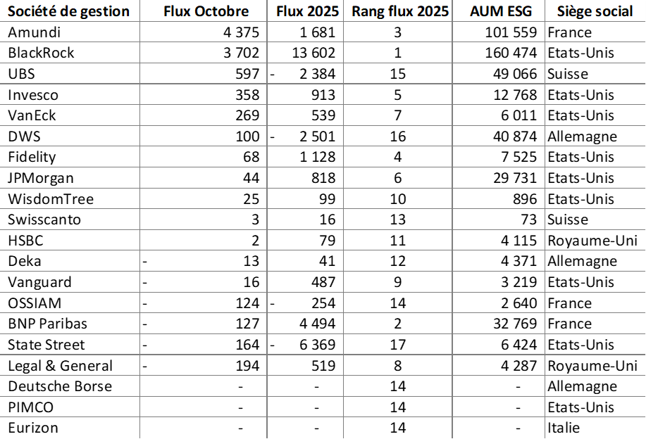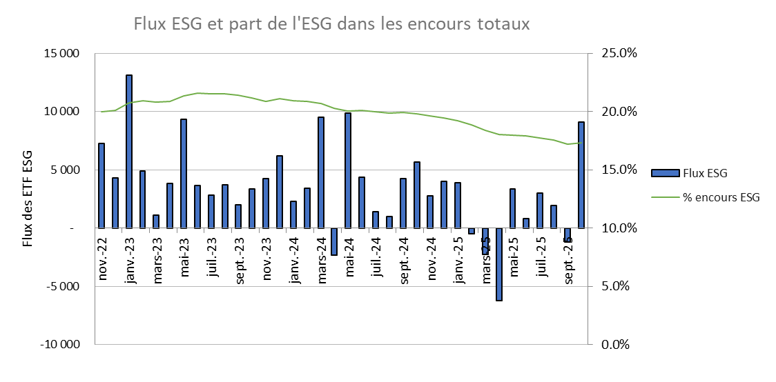 - La collecte ESG est positive pour le sixième mois consécutif et progresse nettement en octobre, au meilleur niveau depuis mai 2024.
