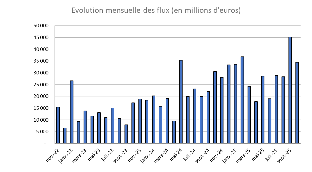 - Avec 32,4 milliards d’euros de souscriptions nettes, octobre confirme la dynamique de marché et se hisse au troisième rang des mois les plus actifs cette année, juste derrière septembre et février.