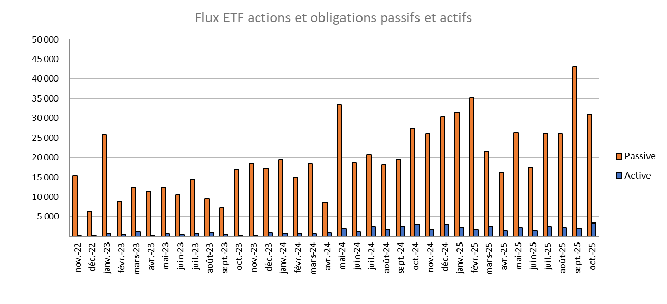 - Les ETF actifs ont capté 9,8 % des flux en octobre, au-dessus de leur moyenne annuelle et de leur part de marché.