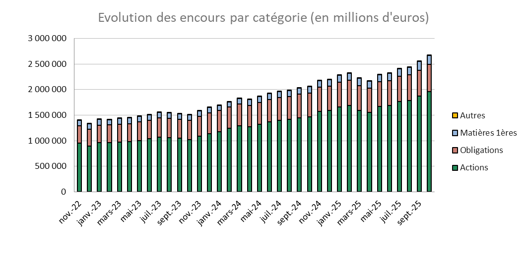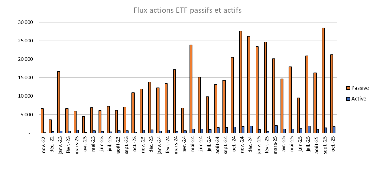 - Les ETF actions concentrent l’essentiel des souscriptions avec près de 23 milliards d’euros. La collecte cumulée depuis le début de l’année atteint désormais 210 milliards d’euros, contre 157 milliards à fin octobre 2024.